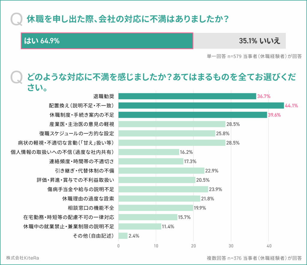 Q1. 6割超が、休職申出時の会社対応に不満。不満の内訳上位は「配置換えの説明不足」44.1%、「休職制度・手続き案内の不足」39.6%、「退職勧奨」36.7%
