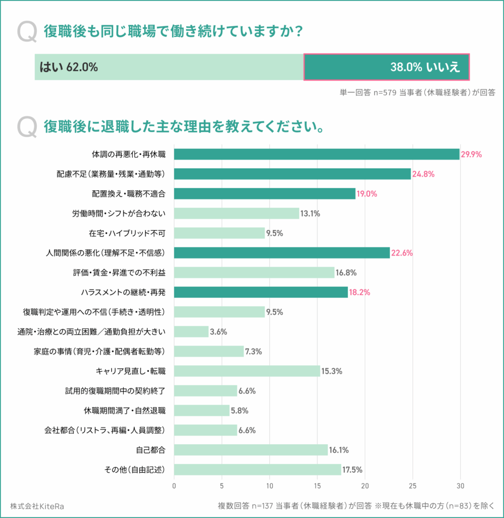 Q10. 復職後の定着は62.0%。退職理由の上位は「体調の再悪化・再休職」29.9%、「配慮不足(業務量・残業・通勤等)」24.8%