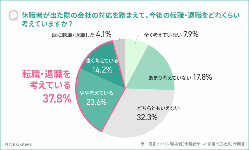 職場側(休職者がいた部署の正社員)に「休職者が出た際の会社の対応を踏まえて、今後の転職・退職をどれくらい考えていますか(単一回答)」と質問したところ、「転職・退職を考えている(やや考えている/強く考えている)」が37.8%、「既に転職・退職した」が4.1%、「考えていない(あまり考えていない/全く考えていない)」が25.7%、「どちらともいえない」が32.3%でした。