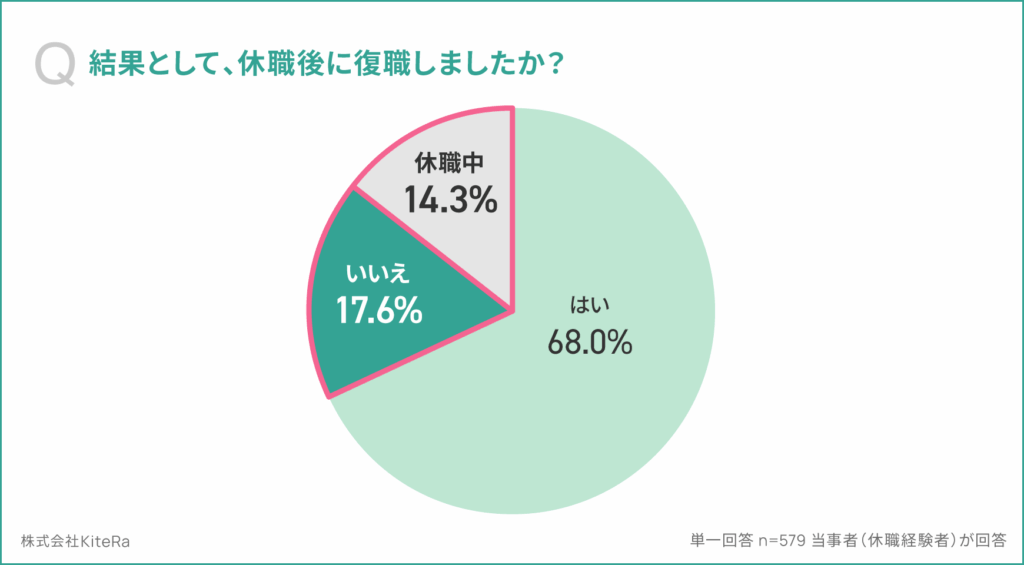 さらに、「結果として、休職後に復職しましたか(単一回答)」の質問に対し、「はい」が68.0%、「いいえ」が17.6%、「休職中」が14.3%でした。