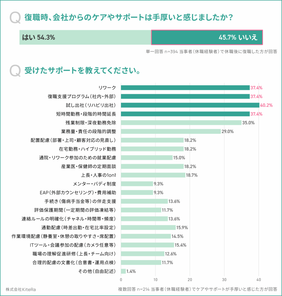 さらに、「復職時、会社からのケアやサポートが手厚いと感じた方」に、「受けたサポートを教えてください(複数回答)」と質問したところ、最も多かったのは「試し出社(リハビリ出社)」が40.2%、次いで「短時間勤務・段階的時間延長」が37.4%、「リワーク」が37.4%、「復職支援プログラム(社内・外部)」が37.4%という結果となりました。