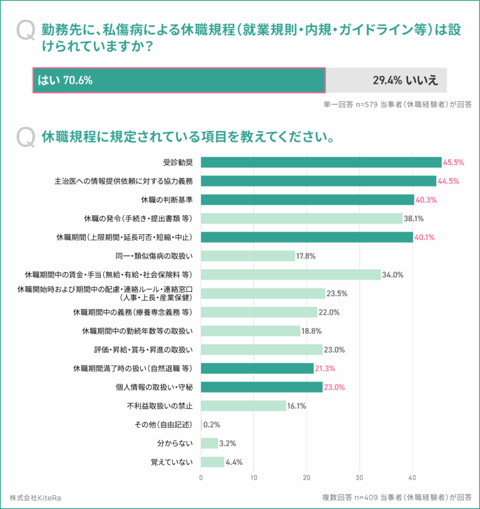 さらに、休職規程が「ある」と回答した方に、「休職規程に規定されている項目を教えてください(複数回答)」と質問したところ、回答が多い順に「受診勧奨」が45.5%、「主治医への情報提供依頼に対する協力義務」が44.5%、「休職の判断基準」が40.3%、「休職期間(上限期間・延長可否・短縮・中止)」が40.1%という結果となりました。