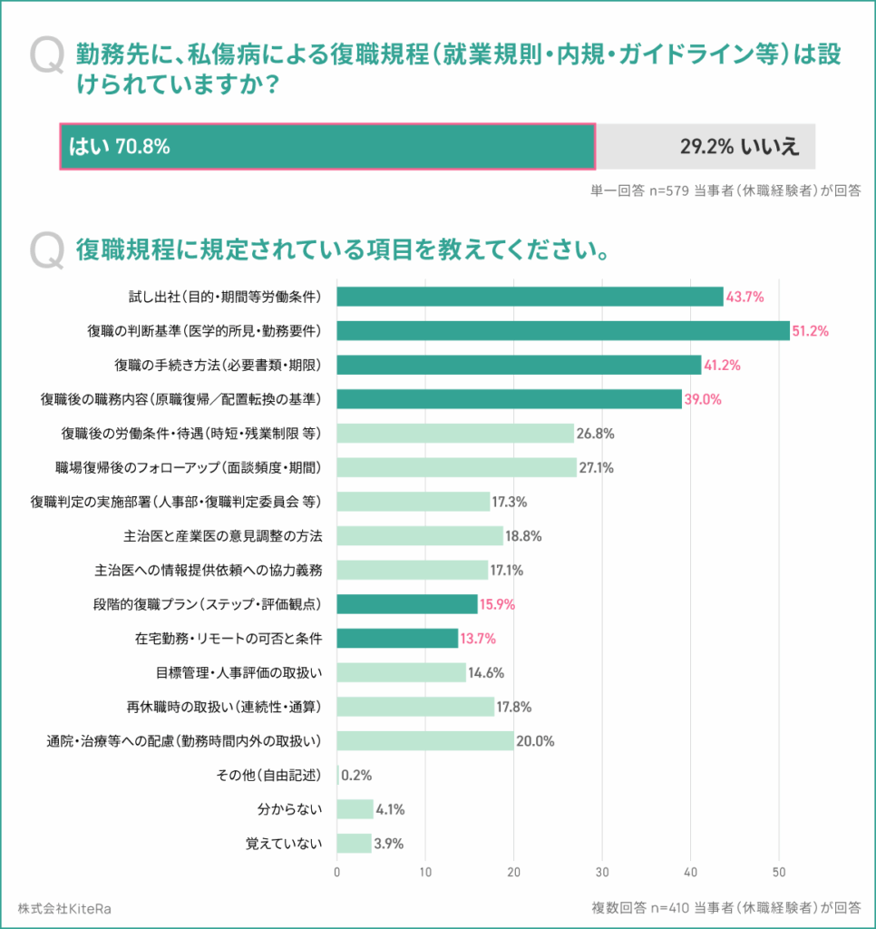 9. 復職規程は7割で整備。主な規定項目は「復職の判断基準」51.2%、「試し出社」41.2%など