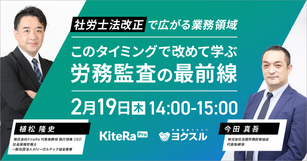 本セミナーでは、KiteRaとヨクスルがタッグを組み、社労士法改正を踏まえた労務監査の最新動向から、実務で押さえるべきポイント、今後の展望までをわかりやすく解説します。業界内外の注目が集まる今だからこそ知っておきたい、労務監査の実情をお届けします。